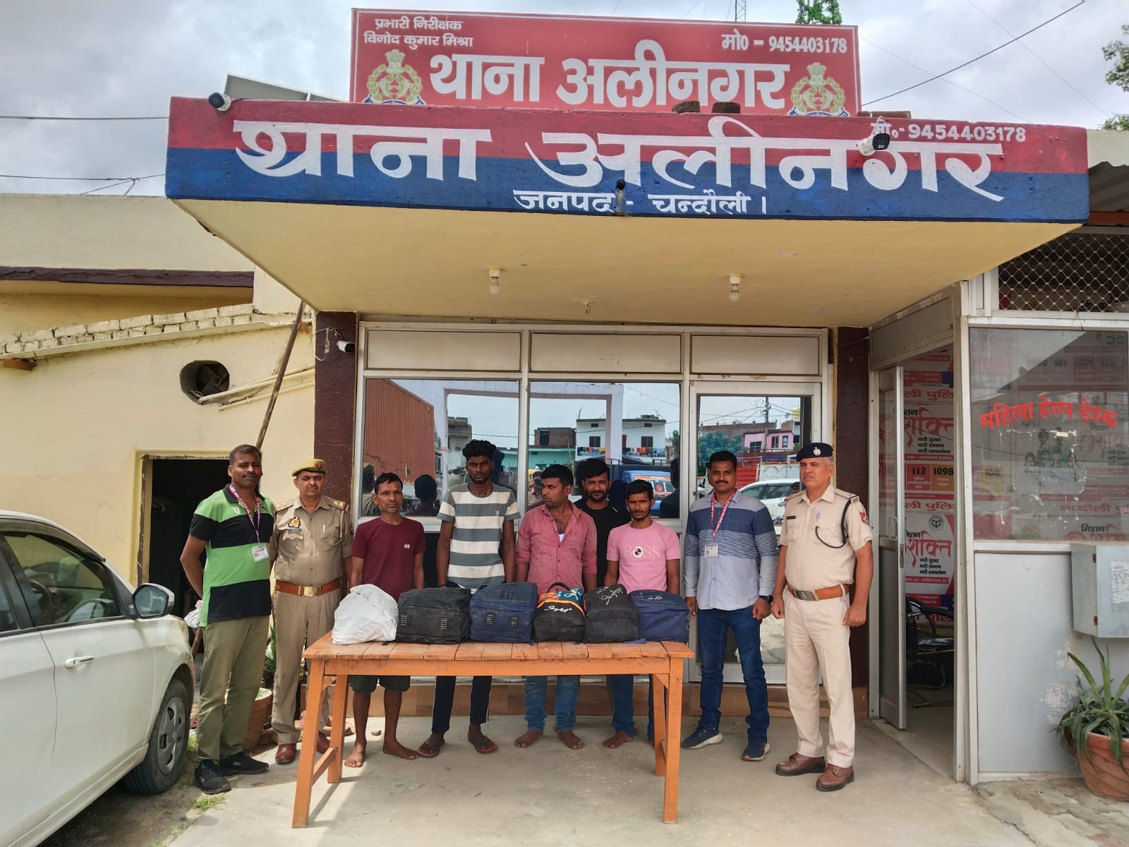चन्दौली । शराब की तस्करी पूर्ण रूप से रोकने के लिए कटिबद्ध आरपीएफ व अलीनगर पुलिस ने रोज शराब के साथ तस्करों को पकड़ रही है । काफी हद तक शराब तस्करी पर लगाम भी लग चुका है । इसी क्रम में प्रभारी निरीक्षक अलीनगर विनोद कुमार मिश्र व आरपीएफ टीम को ने मुखबिर द्वारा प्राप्त सूचना के आधार पर चेंकिंग के दौरान मानस नगर पोखरा के पास से 5 शराब तस्करो को गिरफ्तार कर 62 आफिसर च्वाइस अंग्रेजी शराब प्रत्येक की मात्रा 180 ML, 45 ब्लू लाइम देशी शराब प्रत्येक की मात्रा 200 ML, 17 रायल स्टेज अंग्रेजी शराब प्रत्येक की मात्रा 750 ML, 03 रायल स्टेज अंग्रेजी शराब प्रत्येक की मात्रा 375 ML, 19 अदद 8 PM अंग्रेजी शराब प्रत्येक मात्रा 180 ML, 21 बीयर किंगफिशर प्रत्येक मात्रा 500 ML, नाजायज अंग्रेजी शराब कुल 47.95 लीटर बरामद किया गया । गिरफ्तार 05 अभियुक्तों की पहचान अरुण कुमार पुत्र निरंजन कुमार निवासी जवाहर टोला आरा थाना नवादा जिला नवादा बिहार रवि कुमार पुत्र चन्देश्वर प्रसाद सिंह निवासी कोठही थाना पुनपुन जिला पटना बिहार कृष्णदेव कुमार पुत्र स्व0 जीवन यादव निवासी हरदियाबाद थाना मुफसी जिला मुंगेर बिहार उम्र 26 वर्ष अमित कुमार पुत्र सुनील प्रसाद यादव निवासी हरदियाबाद थाना मुफसी जिला मुंगेर बिहार प्रशान्त कुमार पुत्र स्व0 किशोरी प्रसाद निवासी जहानाबाद थाना जहानाबाद जनपद जहानाबाद बिहार के रुप में हुई है। बरामदगी व गिरफ्तारी के आधार पर थाना अलीनगर पर मु.अ.सं. 280/25 धारा 60 आबकारी अधिनियम में अभियोग पंजीकृत कर आवश्यक विधिक कार्यवाही की जा रही है ।
