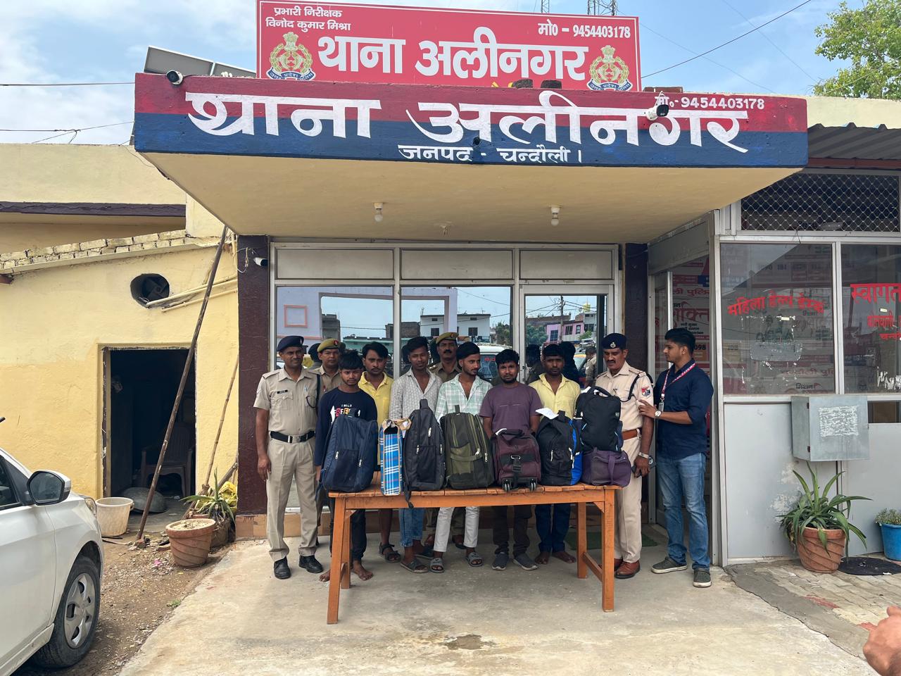 गिरफ्तार अभियुक्तों से उनका नाम पता पूछने पर राजीव पुत्र नन्द किशोर निवासी मोहिउद्दीनपुर थाना पुनपुन जिला पटना बिहार रविशंकर पुत्र अर्जून लाल निवासी मोहिउद्दीनपुर थाना पुनपुन जिला पटना बिहार दिलीप कुमार पुत्र किशोर पासवान निवासी कोड़ोर थाना बेलछी जिला पटना बिहार नवनीत कुमार पुत्र मुकेश कुमार निवासी जोगता थाना चाँन्दी जिला भोजपुर बिहार दुर्गेश कुमार पुत्र राज किशोर सिंह निवासी रामपुर थाना गड़हनी जिला भोजपुर बिहार व हंस लाल विन्द पुत्र बहादुर विन्द निवासी ग्राम चन्दोरूइया थाना भभुआ जिला भभुआ बिहार बताया।